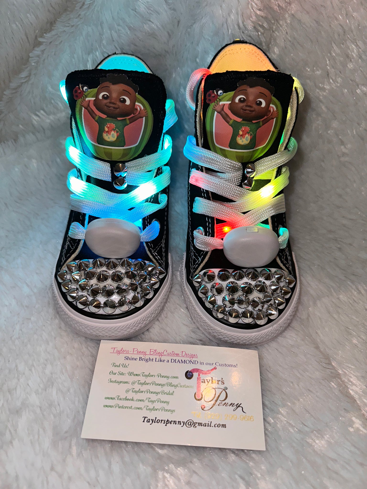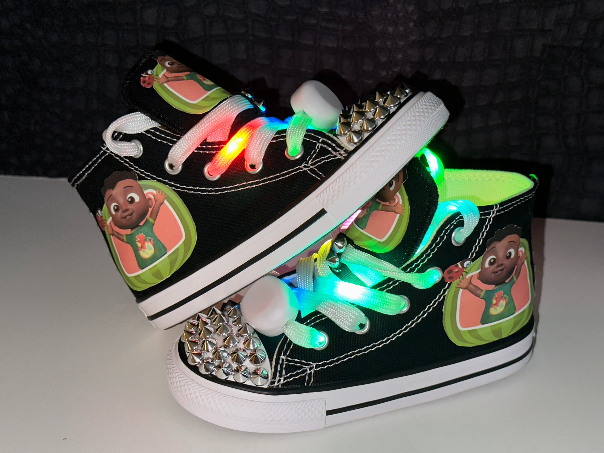 These Cocomelon Cody-inspired bling Converse sneakers are designed to make little ones smile! Featuring soft spikes for added style and fun LED light-up laces, these sneakers are always a favorite with our kiddie models. The bright details and sparkling touches make them perfect for birthdays, themed parties, or everyday standout wear.
