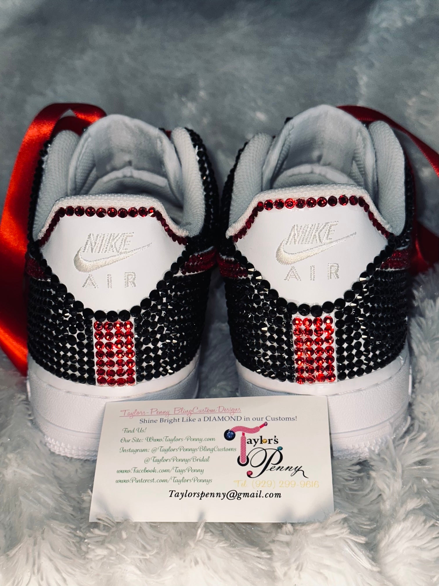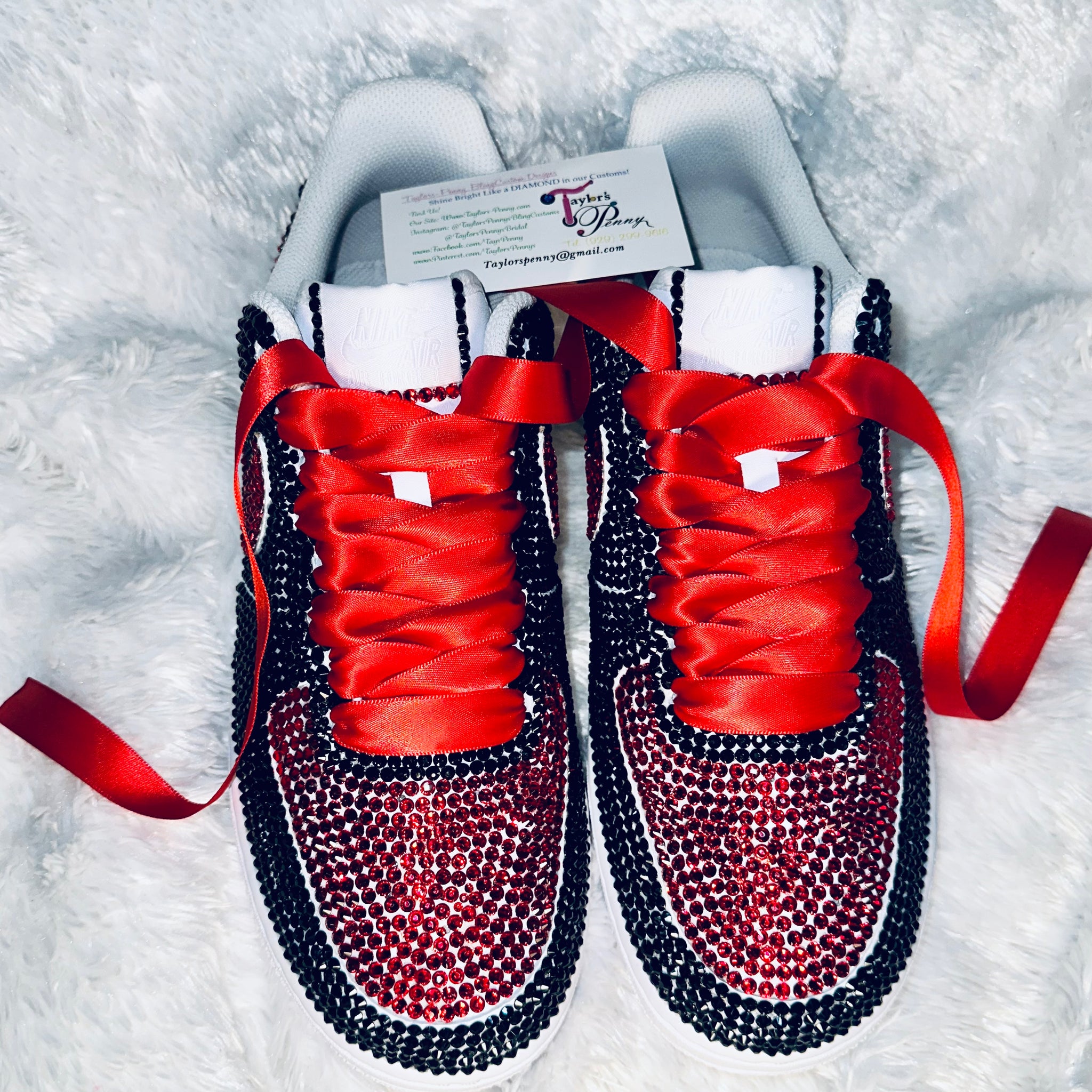 Turn heads with these custom Air Force 1 sneakers, hand-embellished with striking black and red rhinestones for a bold, sparkling look. Each crystal is carefully placed by hand to create a flawless, eye-catching design that’s perfect for everyday wear or special occasions.