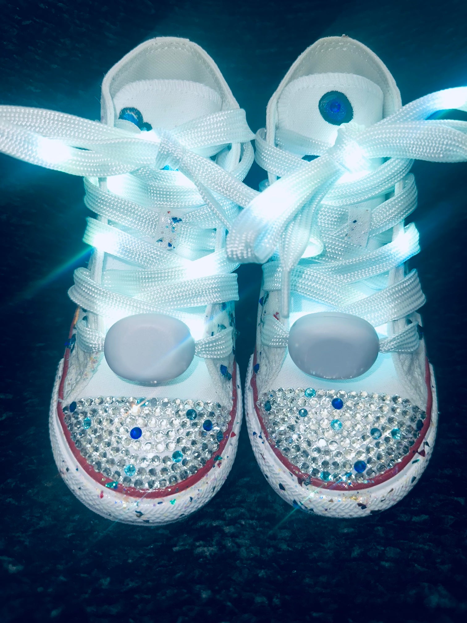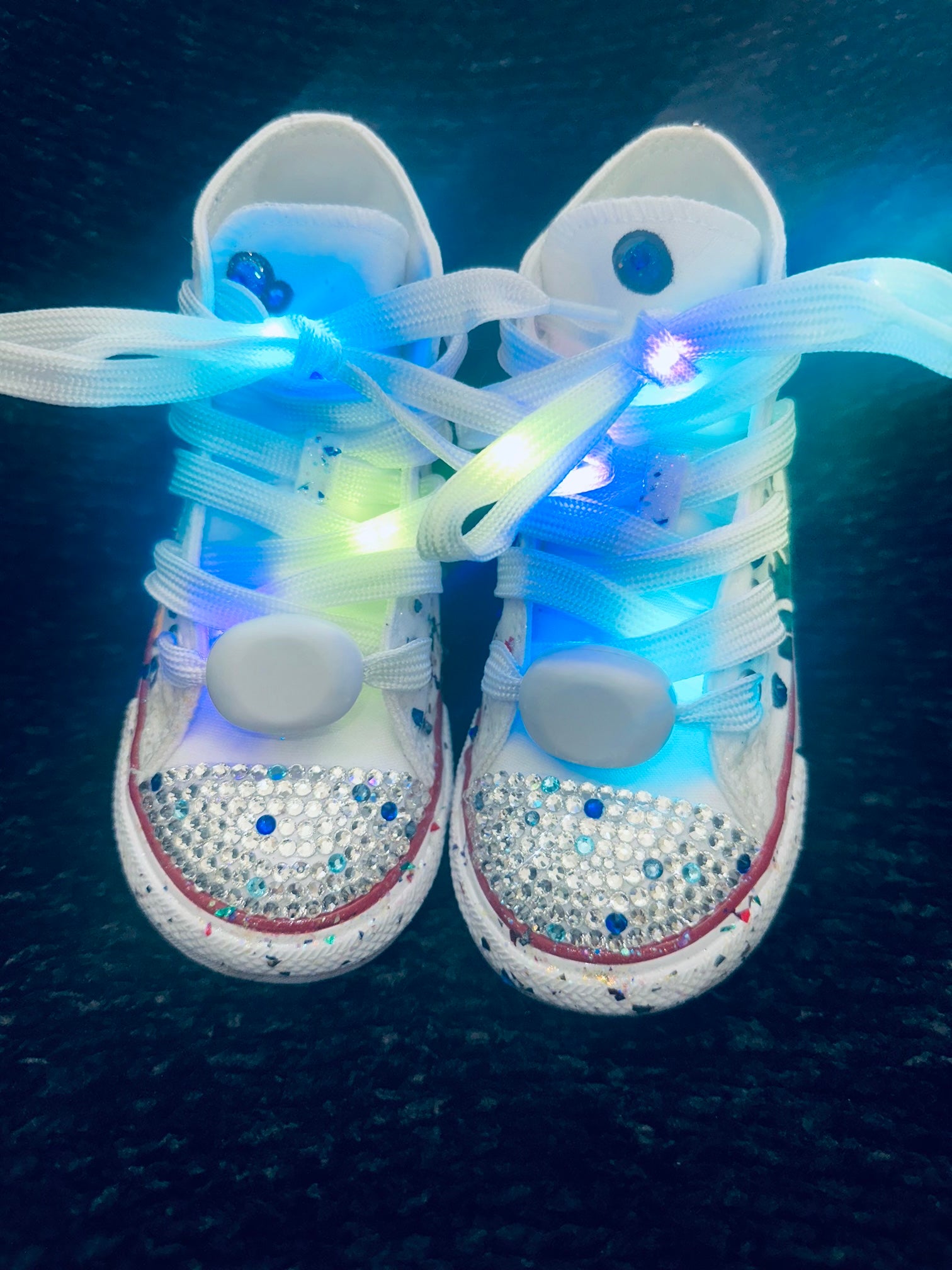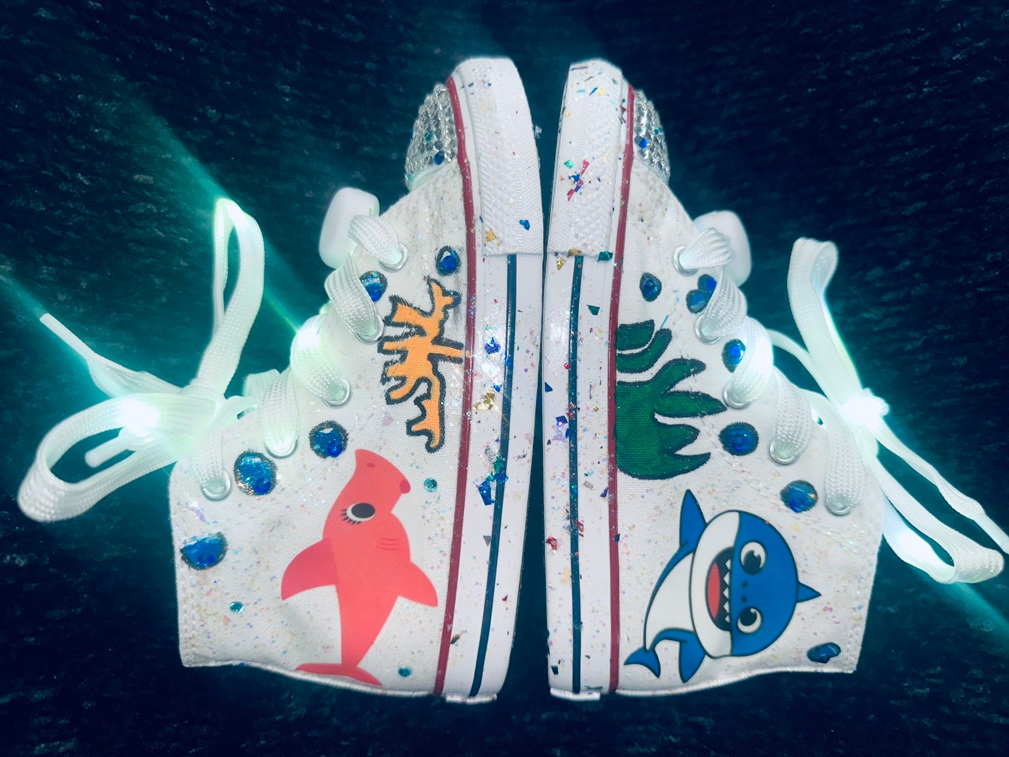 Baby Shark themed and Customized Crystallized Converse. These are perfect for birthdays and costumes. Our LED laces will bring a light up smile to your princesses face. We've glittered the entire sneaker with Glossy Glitter in pink and blue, and we Added Swarovski Crystals in the front like bubbles and all over the sneaker along with our light up laces.